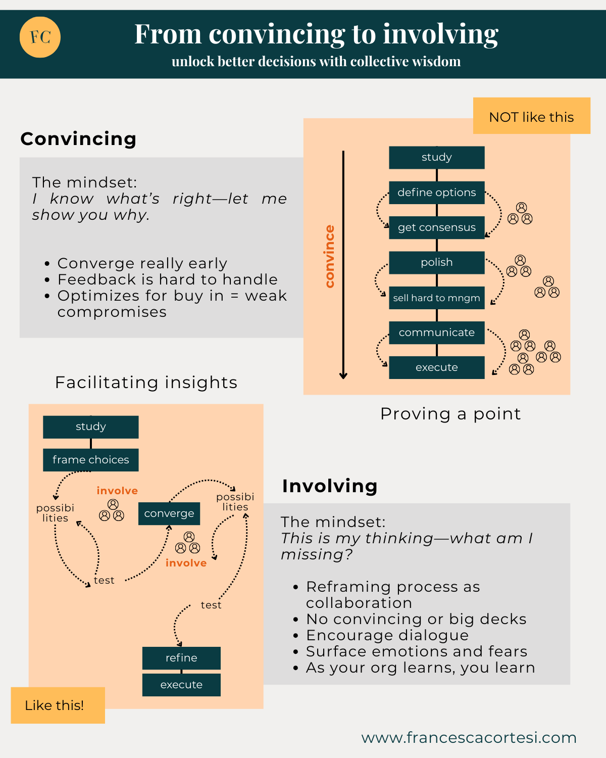 shifting from “Here’s the plan” → to “Here’s my thinking—what am I missing?” to invite to a dialogueNo big decks or data showers.