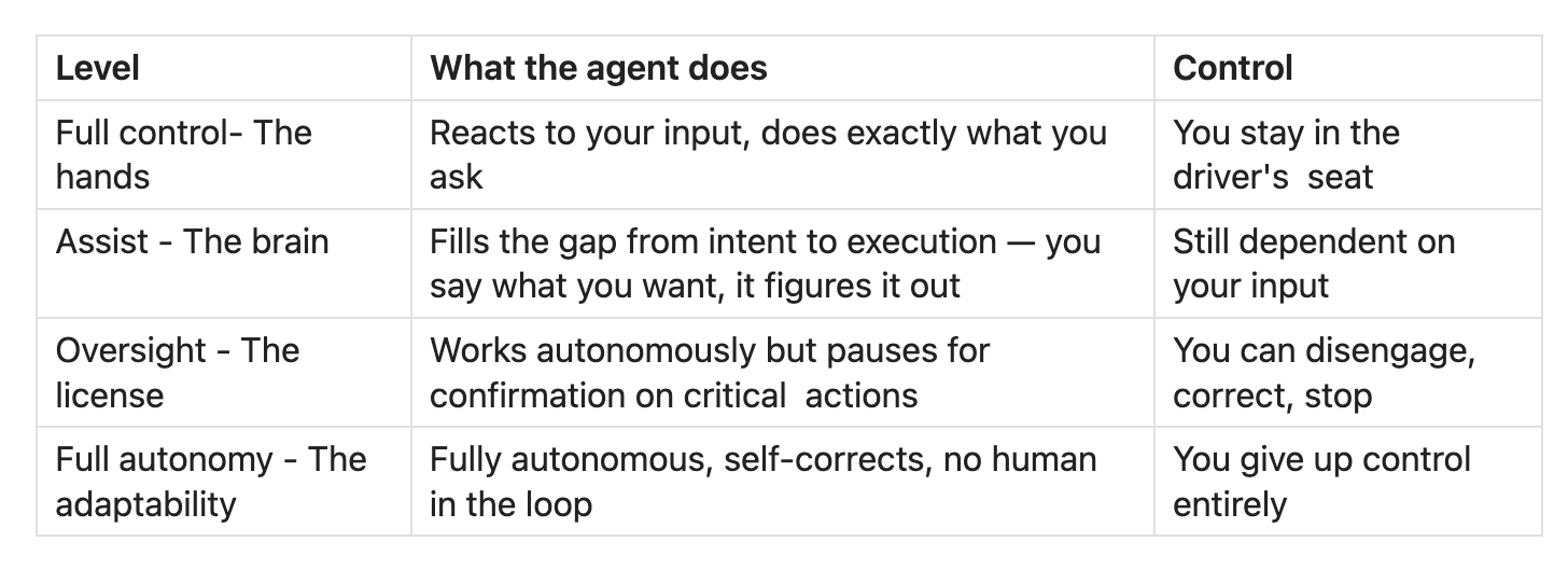 At my current company, Vend, I have the great luxury of being able to bounce ideas with AI experts, that we call "department of AI". Thanks to discussions with them I realized that not all agents are the same. From those discussions I created a simple mental model to think about agents and their connection to control.